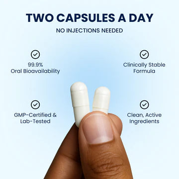 No injections needed. Re+ (BPC-157) is formulated with an advanced arginine-bound version that offers 99.9% oral bioavailability. This means you get all the benefits through convenient capsules – no needles, no discomfort.